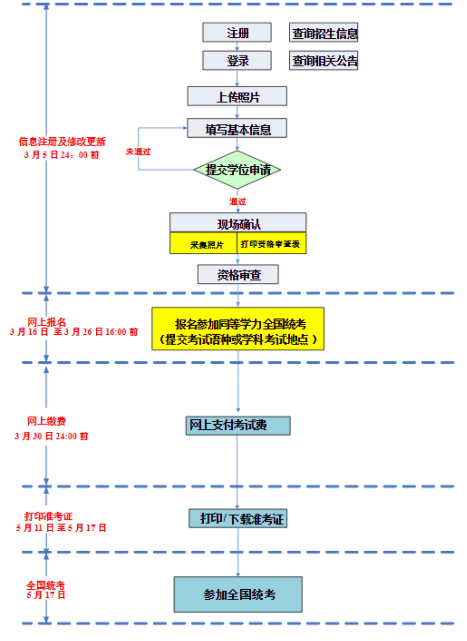 拟参加2026年同等学力全国统考的考生,须于3月5日24:00前在“信息平台”完成注册及在册信息更新,并务必确保个人信息和手机号码准确无误,逾期不可重新注册或修改。报名流程见附件。